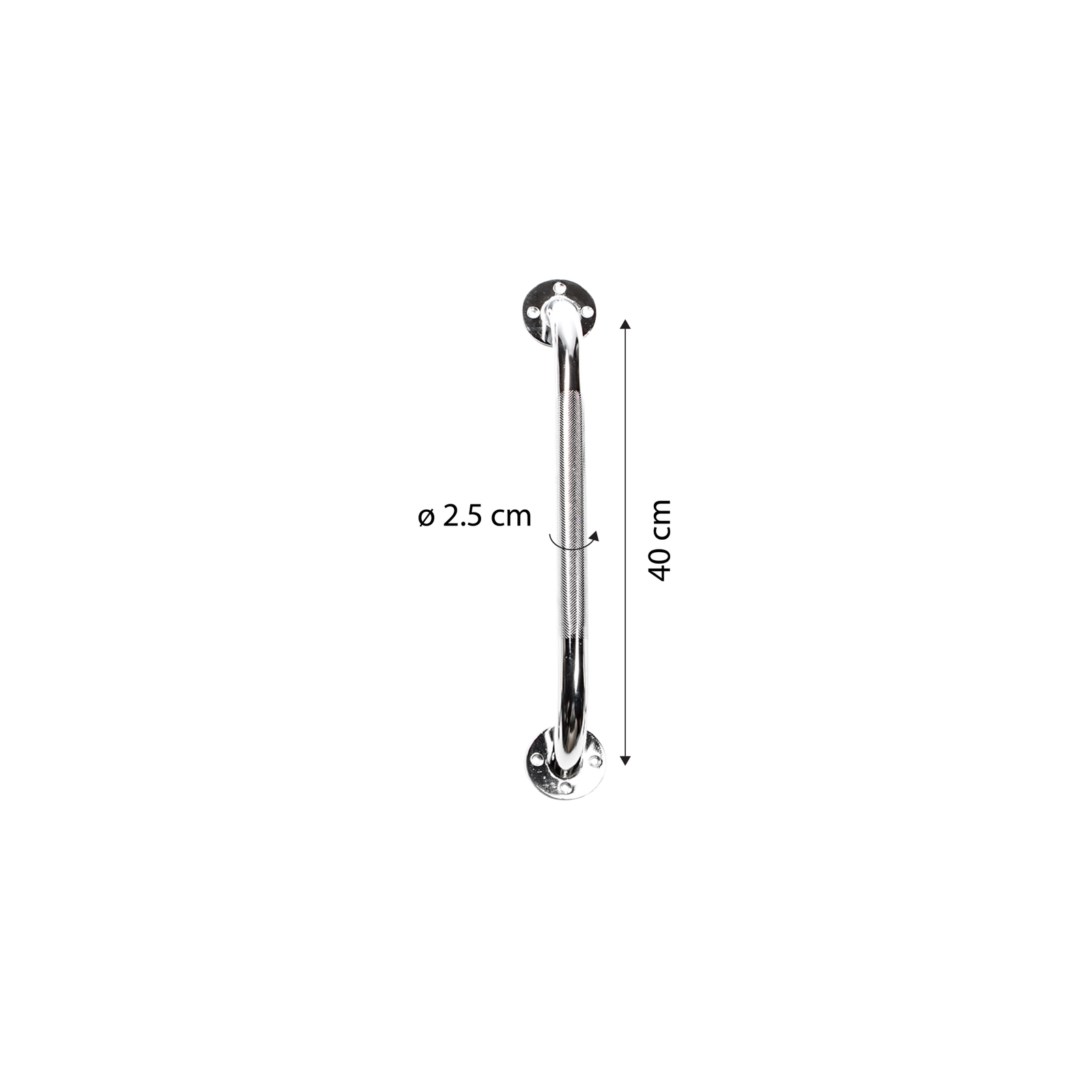 Metalinis chromuotas laikiklis pagamintas iš tvirto plieno. Laikiklio paviršius su specialia tekstūra, kurios dėka žymiai pagerėja sukibimas tarp delno ir paviršiaus, todėl mažėja slydimo pavojus. Tinka visų tipų vonios ar tualeto kambariams. Laikiklis padeda saugiai įlipti/išlipti iš vonios. Laikikliai prie sienos komplektuojami su 6 tvirtinimo varžtais.