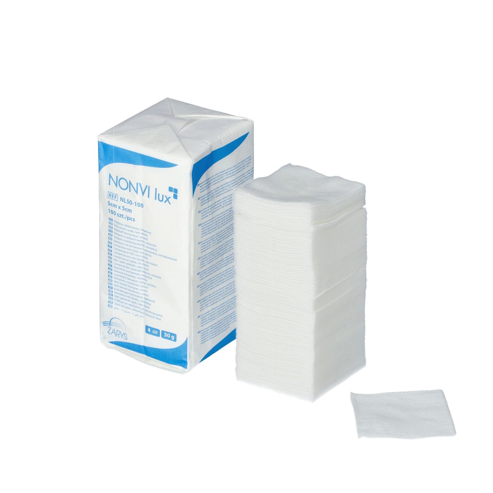 NONVI lux nesterilis tamponas, pagamintas iš hidrofilinės medicininės neaustinės medžiagos, sveriantis 30 g/m². Prietaisas yra minkštas, nesitrinantis ir patvarus. Galima sterilizuoti garais, etileno oksidu arba radiacija. Po sterilizacijos, skirtas bendram žaizdų tvarstymui ambulatorinėmis sąlygomis, operacinėse ir ligoninių palatose. Naudojama operacijos metu kraujui ir kūno skysčiams sugerti iš chirurginių žaizdų. ▪ pagamintas iš hidrofilinės medicininės neaustinės medžiagos, 30 g/m2 ▪ 4 sluoksnių ▪ minkštas, nesitrinantis ir patvarus ▪ galima sterilizuoti garais, etileno oksidu arba gama spinduliuote